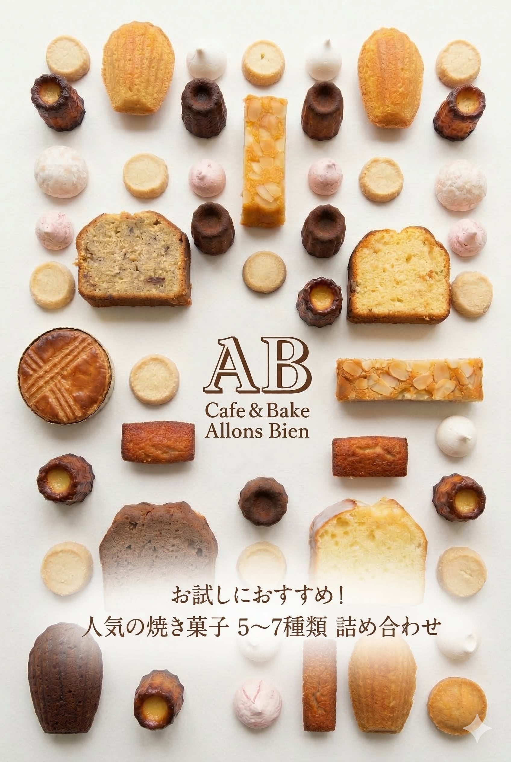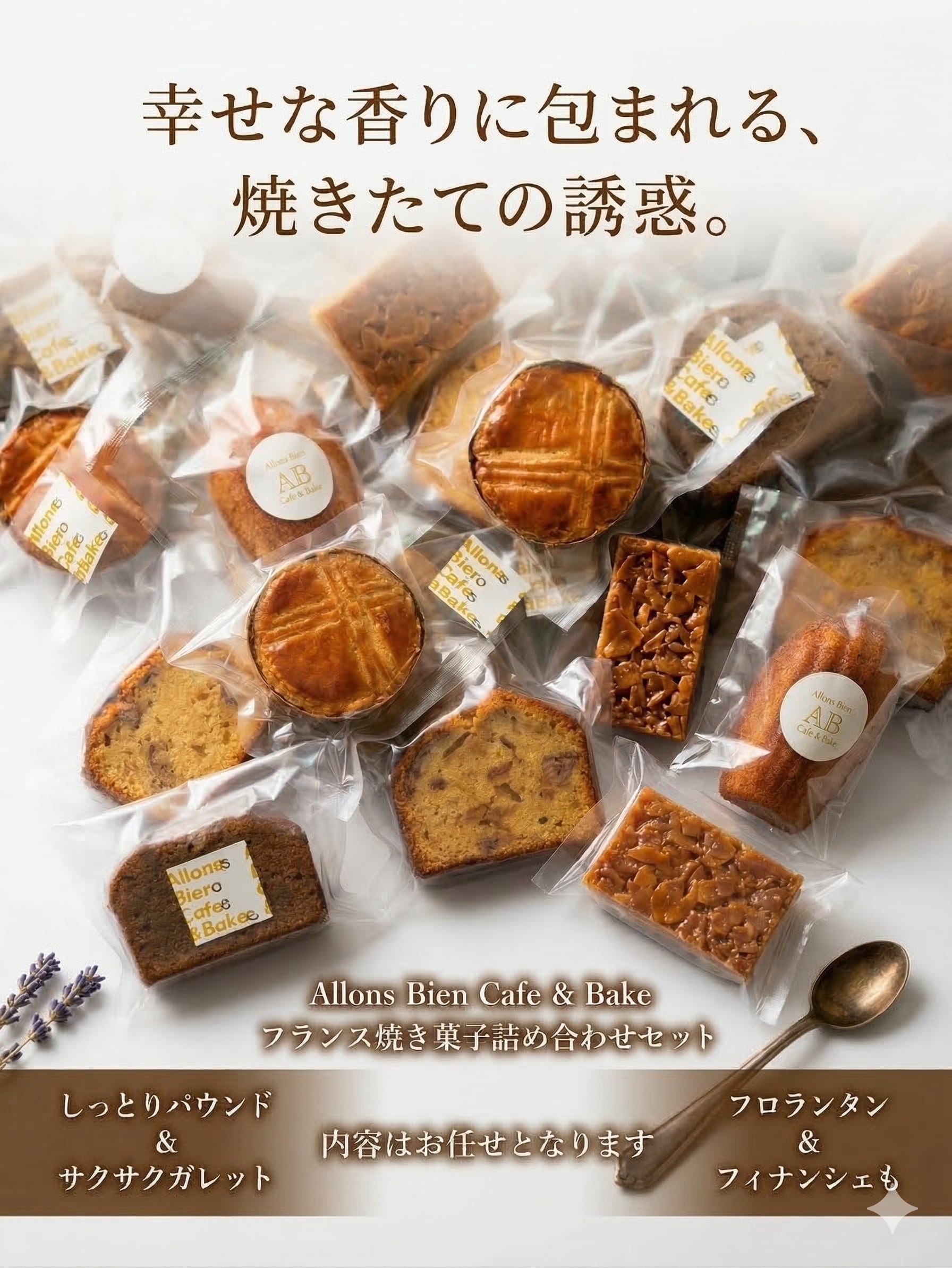 カヌレ、カットパウンドケーキ、マドレーヌなどの焼き菓子から、計5〜7種類をAllons Bienがセレクトして詰め合わせた、おまかせセットです。