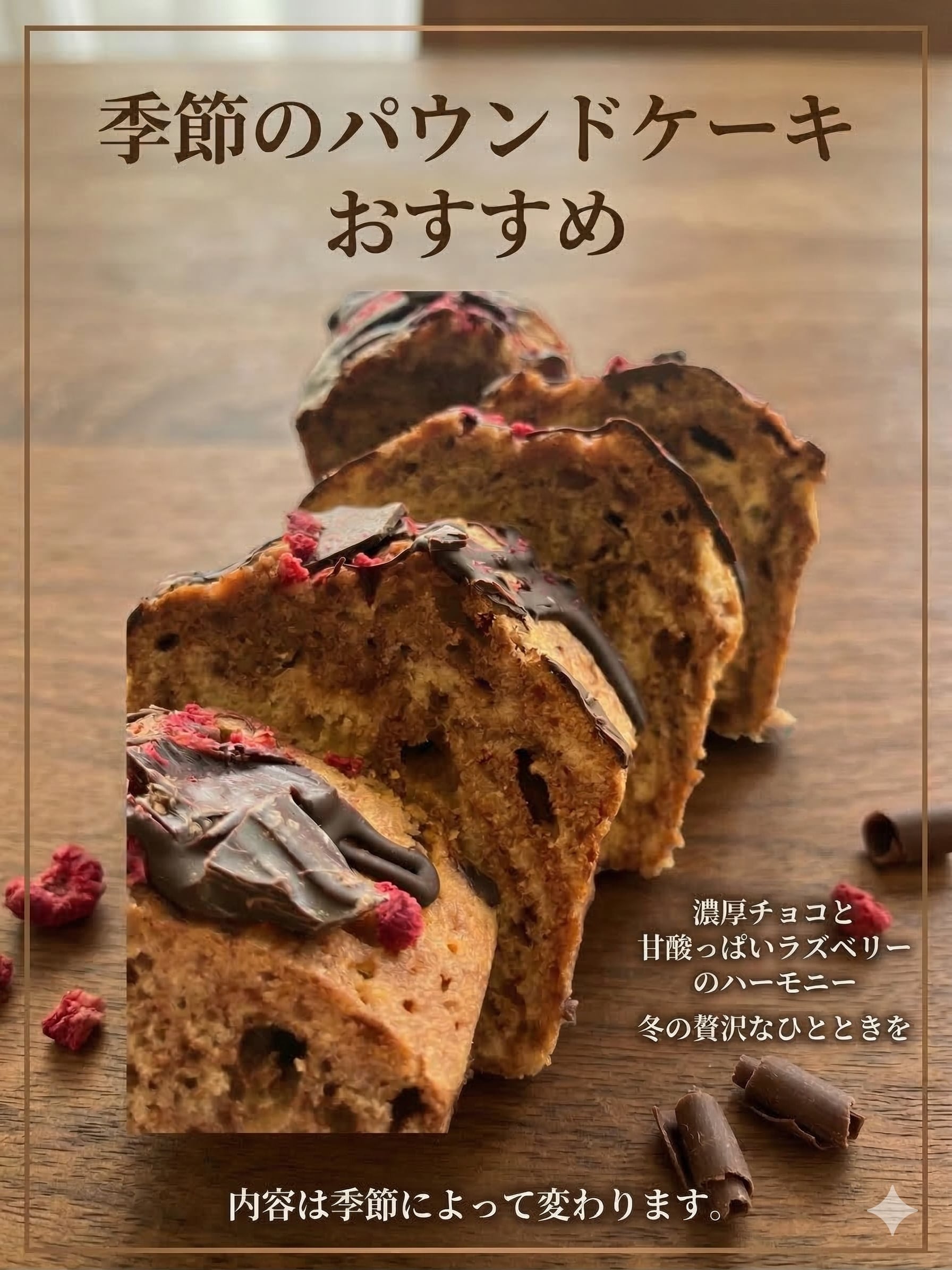 季節のパウンドケーキは、四季折々の新鮮な食材を使用し、特別に仕上げた贅沢なケーキです。しっとりとした生地には、その時々の旬のフルーツやナッツがふんだんに詰まっており、一口ごとに季節感を感じることができます。